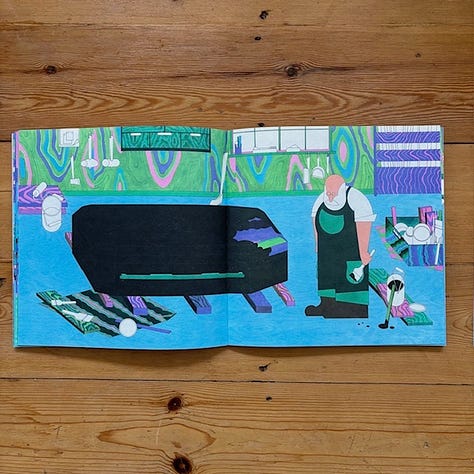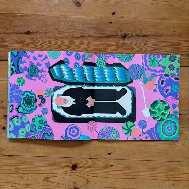 It is sad but uplifting and beautiful. Ida Hong’s artwork is precise but also psychedelic, its such a visually pleasing book. The first time I read it I don’t think i made the connection till the end that it was his own coffin he was making. I can’t pin point exactly what appeals to me about this one, its just great. Some times the simple ideas work the best.